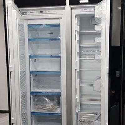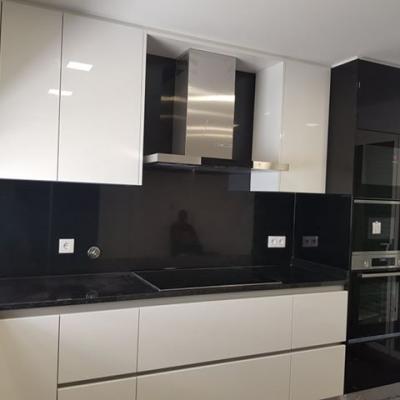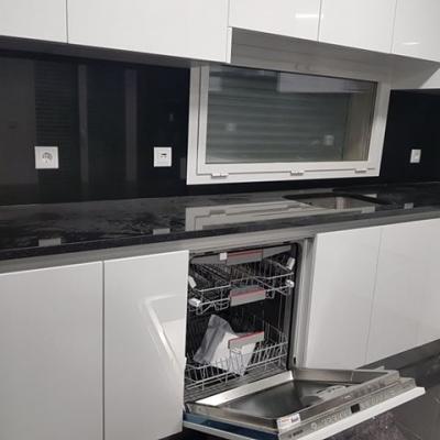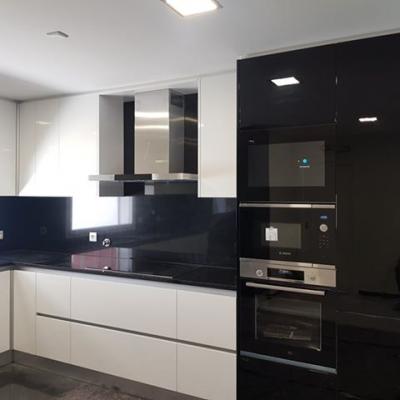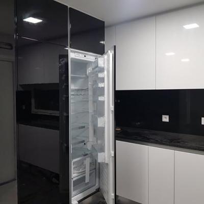 - Cozinha com frentes em lacado alto brilho em preto e branco.