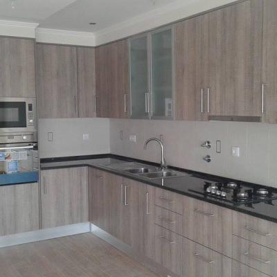 - Cozinha com frentes em melamina, superiores em vidro foscado.